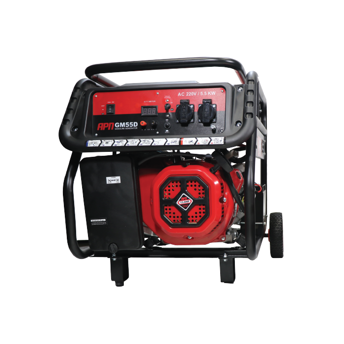 موتور برق بنزینی apn مدل GM55D دارای سیستم راه اندازی استارتی و هندلی سیستم لرزه گیر جهت جلوگیری از لرزش در کارهای طولانی به همراه نمایشگر دیجیتال ولتاژ خروجی به همراه چرخ و دسته جهت سهولت در جا بجایی برای مصرف کننده.